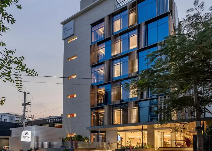 Skyla Studios & Suites - Kondapur Haiderabad hotel met 63 kamers biedt 2 restaurants aan en ligt in de HITEC City wijk binnen 6 minuten wandelafstand van Jayabheri Silicon Tower. Dit 4-sterrenhotel met een winkelgebied en een restaurant bevindt zich binnen 2 km afstand van de Botanische Tuin van Hyderabad in Haiderabad.